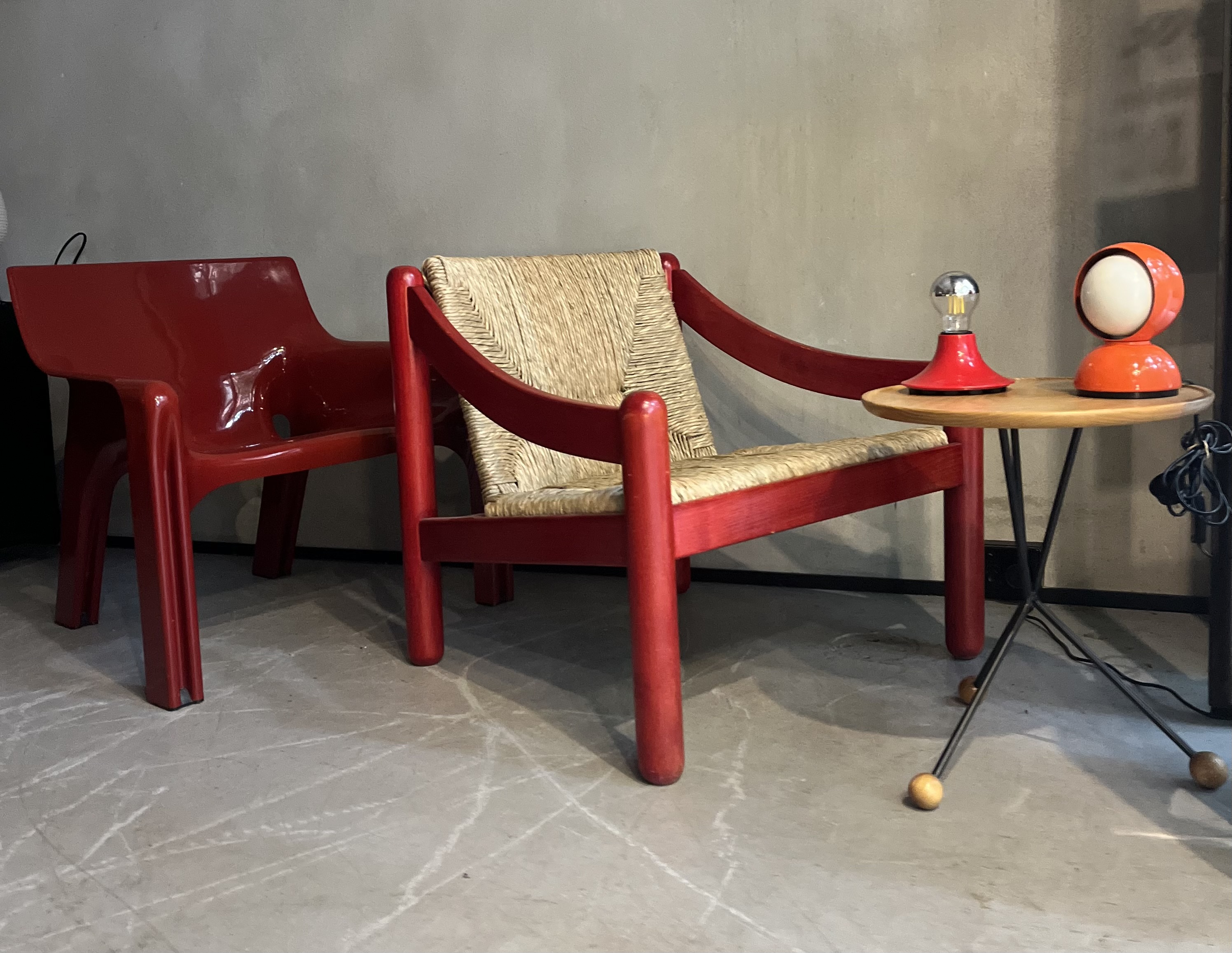 Red coloured solid beech frame with. seat and back of woven rush. Designed by Vico Magistretti for Cassina Italy